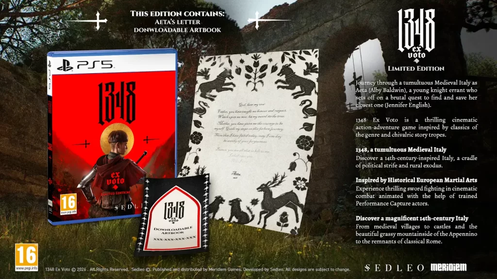 A Meridiem anunciou o lançamento das edições físicas de 1348 Ex Voto para PlayStation 5, programado para 4 de junho de 2026. O jogo 1348 Ex Voto, desenvolvido pela Sedleo e publicado digitalmente pela Dear Villagers, é uma aventura cinematográfica em terceira pessoa ambientada na Itália medieval.
