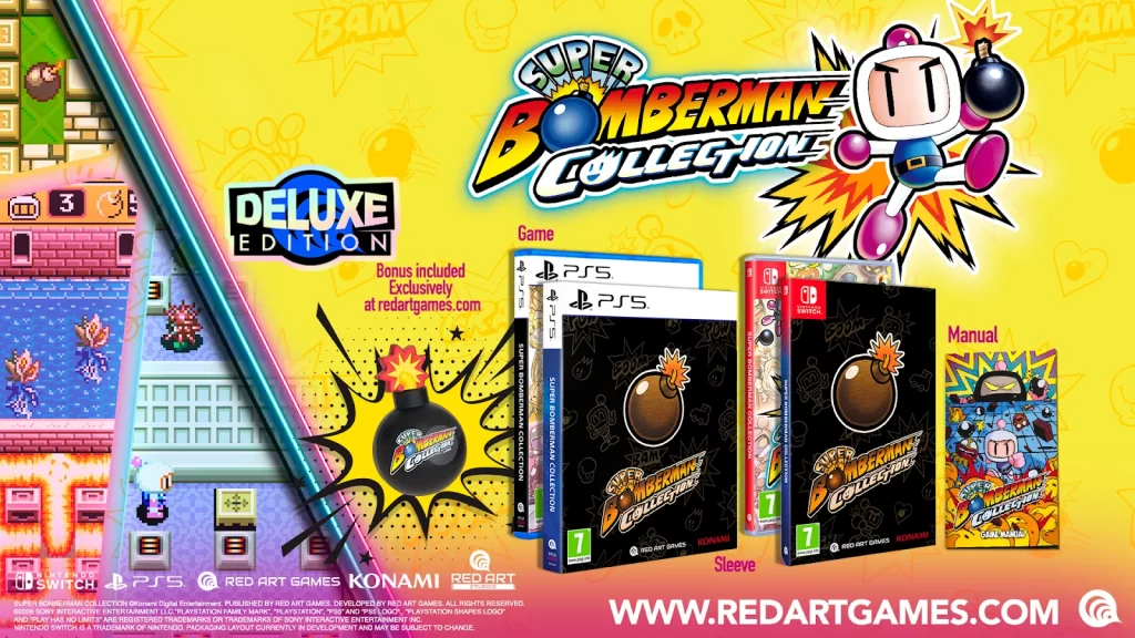 A SUPER BOMBERMAN COLLECTION terá edições Standard, Deluxe e Collector’s Edition, além da exclusiva Nintendo Switch 2 Edition. Cada edição vem com itens especiais, como manuais, capas alternativas e até um anti-stress em formato de bomba.