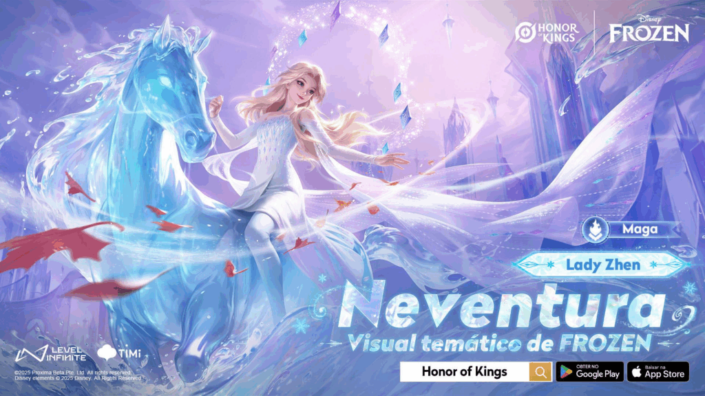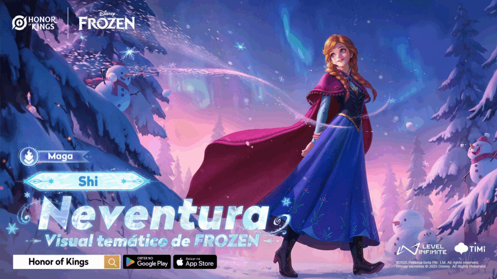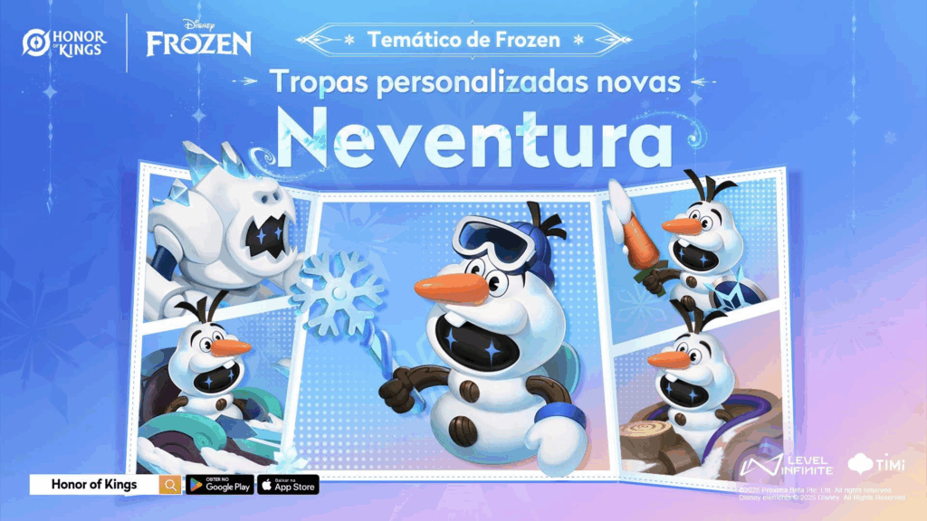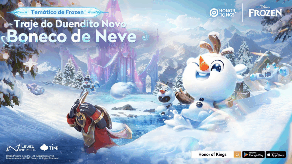 A colaboração entre Honor of Kings e Frozen traz de volta a Maravilha de Inverno, com visuais temáticos para as Tropas e uma nova roupa para o Duendito. Entre 28 de novembro e 8 de fevereiro, os jogadores poderão desfrutar de conteúdos exclusivos e recompensas limitadas.