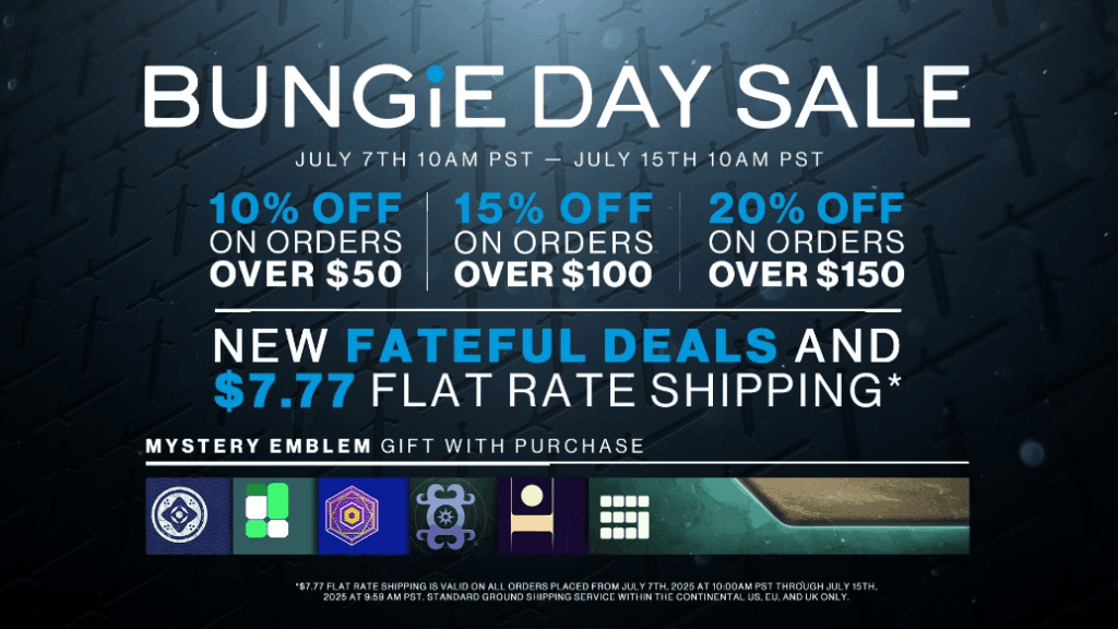 Uma surpresa especial aguarda a todos os compradores: um emblema misterioso do Destiny 2 será concedido em cada compra. Com designs clássicos da Bungie Store, como o emblem Lockbox, essa é uma chance única para os colecionadores. Além disso, o frete terá desconto especial de $7.77 para pedidos nos EUA, UE e Reino Unido.