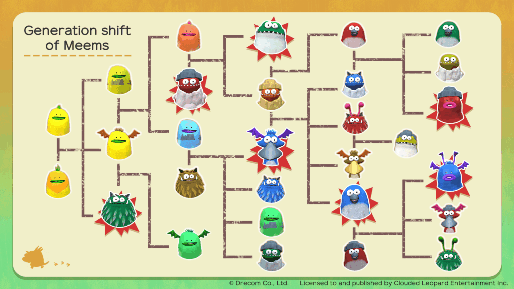 Sob a sombra da Árvore Mundial, as Meems aguardam sua orientação. Elas evoluem de maneira imprevisível à medida que comem, dormem e brincam, criando uma variedade infinita de Meems com características únicas. Cada exploração traz novas habilidades e transformações, enquanto a expansão da vila com novas instalações torna a vida das Meems mais alegre.