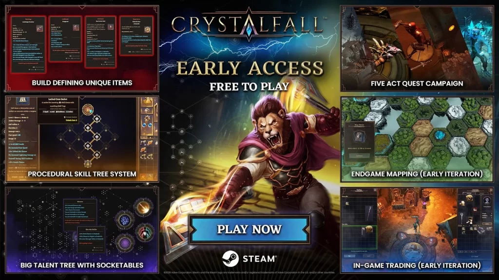 A CRG Studio anunciou que Crystalfall, seu ARPG online gratuito ambientado em um mundo steampunk, foi oficialmente lançado em Early Access no Steam. O jogo Crystalfall permite que jogadores de todo o mundo explorem um mundo em evolução com combate envolvente, construções baseadas em loot e desafios competitivos de final de jogo.