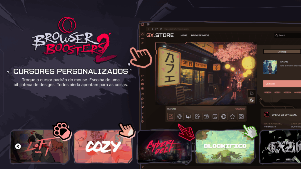 O Opera GX, conhecido por ser o navegador dos gamers, agora oferece a possibilidade de personalizar completamente o cursor do mouse. Com a colaboração da Sweezy Cursors, os usuários podem escolher entre mais de 30 cursores, incluindo designs animados e estáticos, para adicionar um toque de estilo à sua navegação.