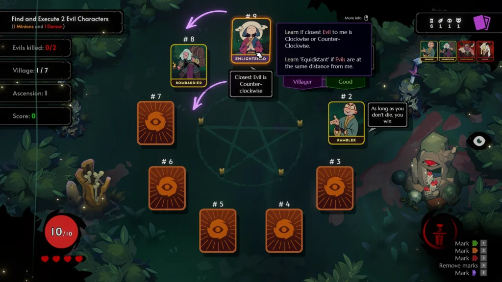 Em Demon Bluff, os jogadores devem analisar pistas fornecidas por cartas de aldeão para discernir a verdade. Se o jogador escolher corretamente, conseguirá purificar a aldeia; caso contrário, será o fim da rodada e o início de uma nova tentativa.
