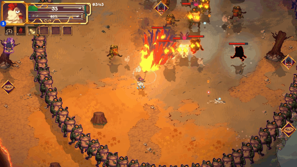 Além do desafio do infinito, Machick 2 oferece um modo história envolvente, mergulhando os jogadores em uma guerra apocalíptica entre galinhas e sapos. Com cutscenes desenhadas à mão, o jogo revela mistérios, humor e referências especiais. O gameplay permite criar builds poderosas e temáticas únicas, ampliando a experiência e garantindo um fator replay praticamente infinito.