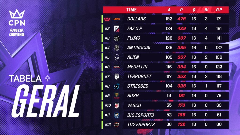 A LOS Dollars brilhou na final da CPN Favela Gaming, conquistando 475 pontos e garantindo o primeiro lugar. Com reviravoltas emocionantes, a equipe demonstrou consistência e determinação ao longo do campeonato, superando adversários e se consagrando como campeã.