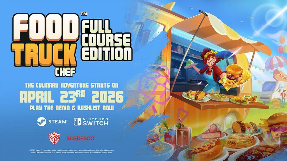 Food Truck Chef: Full Course Edition, desenvolvido pela Nukebox Studios e publicado pela SOEDESCO, será lançado no dia 23 de abril nas plataformas Steam e Nintendo Switch. O anúncio foi feito em 19 de março de 2026, acompanhado de um novo trailer que destaca a jogabilidade dinâmica de cozinha e gerenciamento do jogo. O jogo promete trazer uma experiência única para os fãs de simuladores de cozinha.