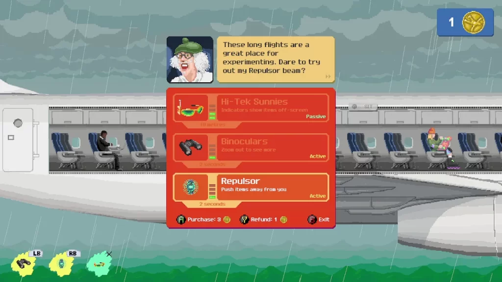 Enquanto interage com os passageiros no avião, você pode embarcar em missões para descobrir a causa desse pesadelo da aviação. Use as moedas ganhas em quedas anteriores para adquirir itens e melhorias que tornarão suas futuras quedas mais divertidas. A demo oferece 2 itens atualizáveis e 7 habilidades ativas para explorar.