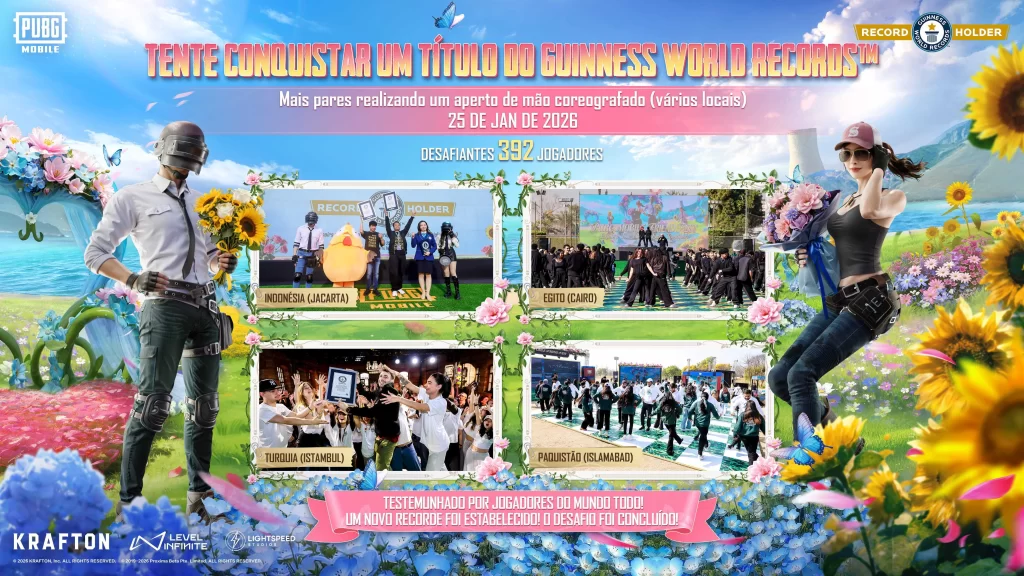 No último domingo, 392 jogadores de PUBG MOBILE ao redor do mundo se uniram para quebrar o recorde do Guinness World Record de Mais Pares Realizando um Cumprimento Coreografado. Esse momento marcou o início do FRIEND FEST, um evento que celebra a amizade e a cooperação entre os jogadores.