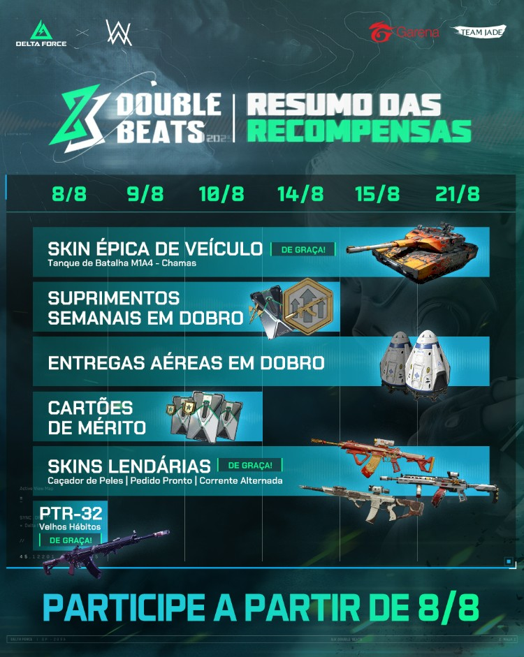A atualização traz uma colaboração temática exclusiva, uma arma de fogo inédita e conjuntos de skins lendários. Os jogadores terão a oportunidade de participar do Evento Double Beats e desbloquear conteúdos especiais.