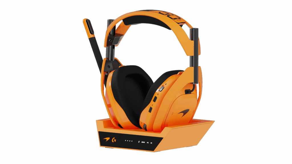O ASTRO A50 X McLaren Racing Edition apresenta o icônico tom Papaya da McLaren, drivers PRO-G Graphene para som cristalino, tecnologia PLAYSYNC para conexão simultânea com Xbox, PlayStation 5 e PC, além de conexão LIGHTSPEED sem fio de baixa latência.