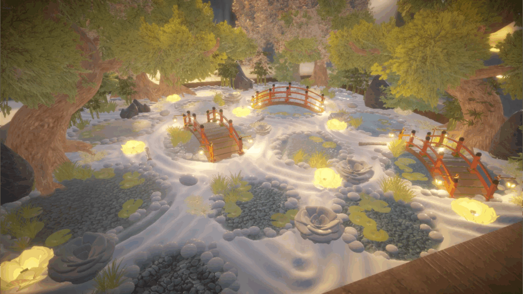 No Dream Garden, você terá a liberdade de projetar e aprimorar a paisagem do seu jardim. Use ferramentas como o rastelo para criar padrões intricados em seixos e areia. Com esculturas desenhadas à mão, lagos com lírios, árvores, pontes e muito mais, as possibilidades são infinitas.