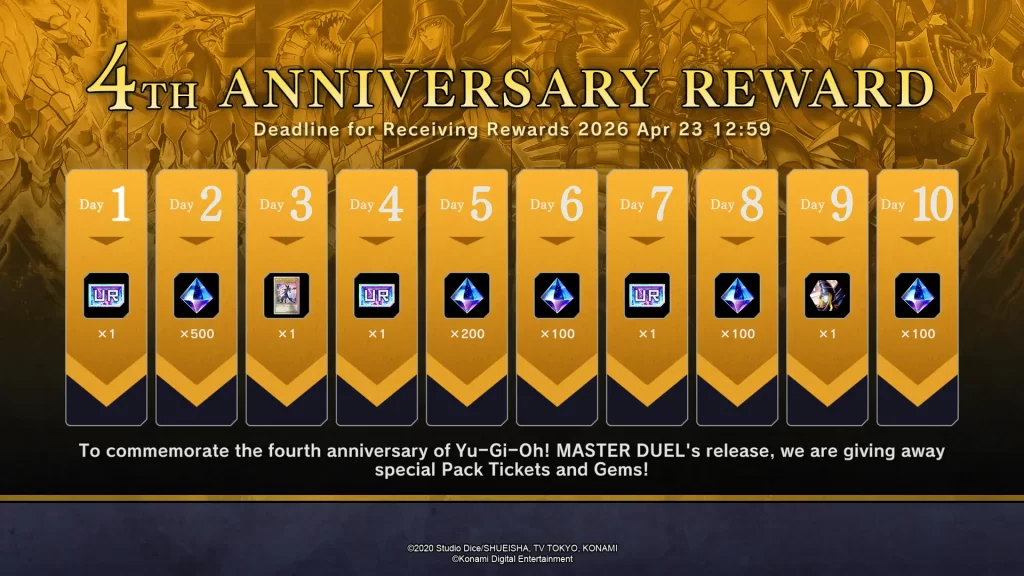 Em resumo, o Yu-Gi-Oh! MASTER DUEL está repleto de novidades para comemorar seu 4º aniversário, com o Mago Negro como grande destaque. Os duelistas poderão aproveitar bônus exclusivos, cartas especiais e acessórios temáticos durante toda a campanha. Não perca essa oportunidade de celebrar junto com a comunidade de Yu-Gi-Oh! neste evento especial!