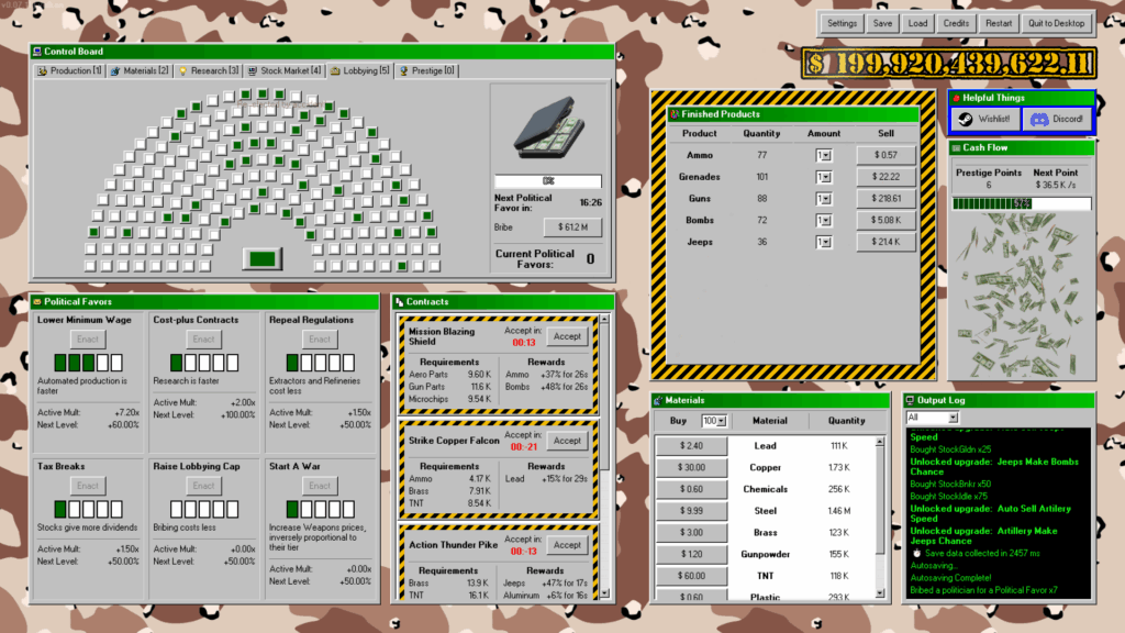 No ‘Military Incremental Complex’, a ganância é uma virtude. Desde a produção de balas e granadas até a fabricação de tanques, jatos e até mesmo armas nucleares, você pode expandir sua cadeia de suprimentos, automatizar a produção e assistir seu capital crescer exponencialmente.