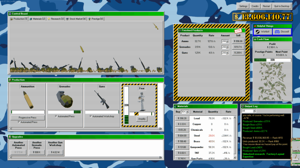 No jogo ‘Military Incremental Complex’, você terá a oportunidade de se tornar um mestre fabricante de armas, lucrando trilhões de dólares. Desde a produção de balas e granadas até a fabricação de tanques e jatos, o mundo das armas estará ao seu alcance. Aumente a eficiência da sua fábrica, automatize a produção e veja sua fortuna crescer exponencialmente.