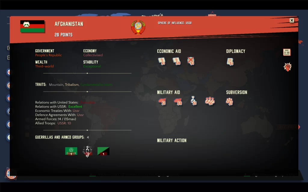 - Jogue como EUA ou URSS: Cada superpotência possui alianças regionais e tensões nucleares próprias.