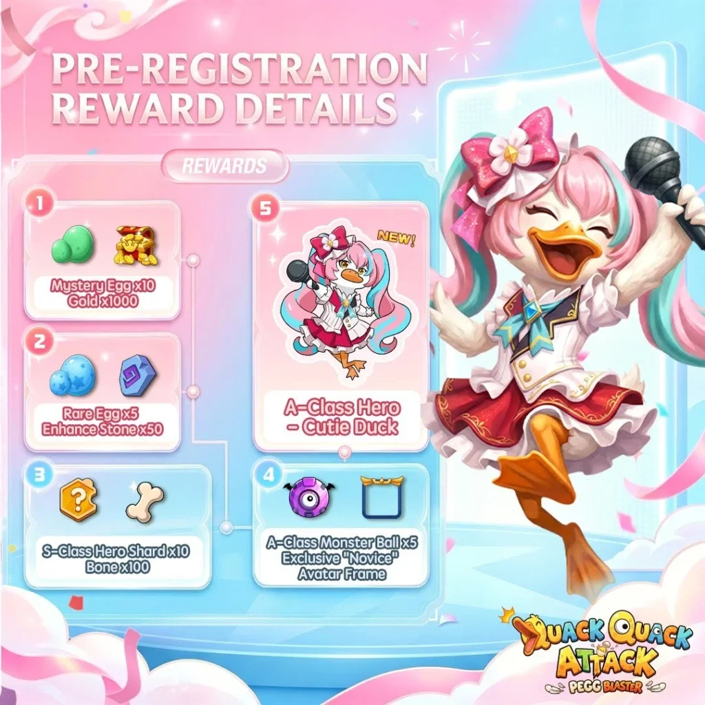A pré-inscrição já está aberta no site oficial de Quack Quack Attack – PEGG Blaster. Todos que se registrarem antes do lançamento receberão as seguintes recompensas: