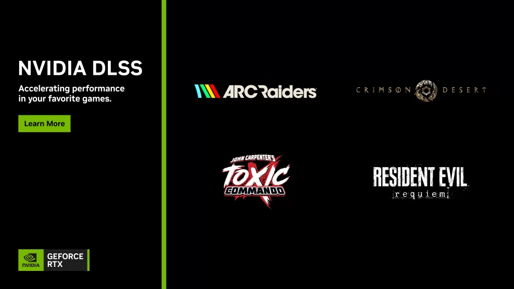 A NVIDIA anunciou nesta semana que Resident Evil Requiem chega com suporte nativo ao DLSS 4 com Multi Frame Generation, recursos exclusivos para quem joga com as GPUs GeForce RTX. Além disso, Crimson Desert e John Carpenter’s Toxic Commando também contarão com essa mesma tecnologia no lançamento, enquanto ARC Raiders já está disponível com suporte ao DLSS 4 com Multi Frame Generation e outros recursos RTX.