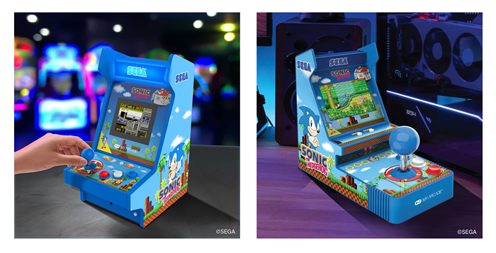 O Sonic The Hedgehog Joystick Player é uma máquina de arcade portátil com joystick em tamanho real. Com títulos como Sonic The Hedgehog e Sonic The Hedgehog 2, este dispositivo também possui uma tela colorida de 3,5 polegadas e pode ser alimentado por pilhas AA ou cabo USB-C.