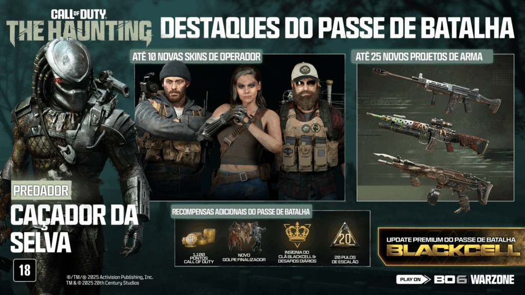O Predador lidera o conteúdo do Passe de Batalha, com skins de operador inspiradas em filmes de terror. O Passe oferece mais de 110 conteúdos desbloqueáveis, incluindo novas armas e acessórios.