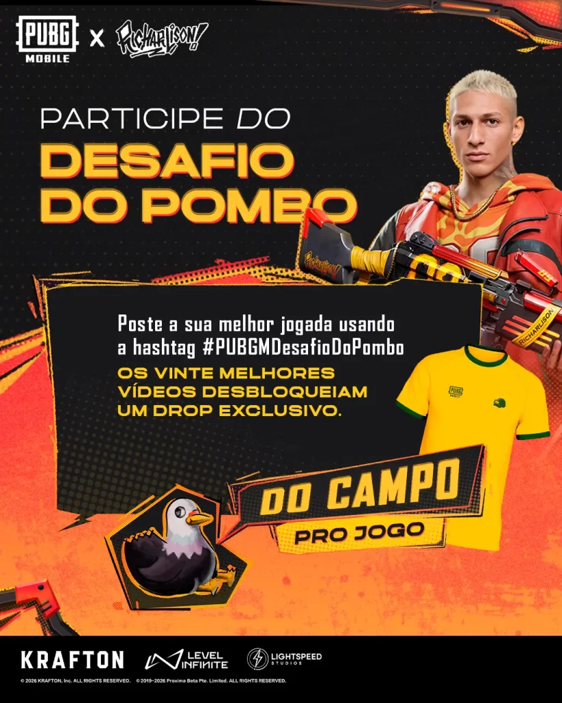 As ações fazem parte da colaboração entre PUBG MOBILE e Richarlison, que foi introduzida na Atualização da Versão 4.3. Os conteúdos relacionados à colaboração estarão disponíveis até 15 de abril.